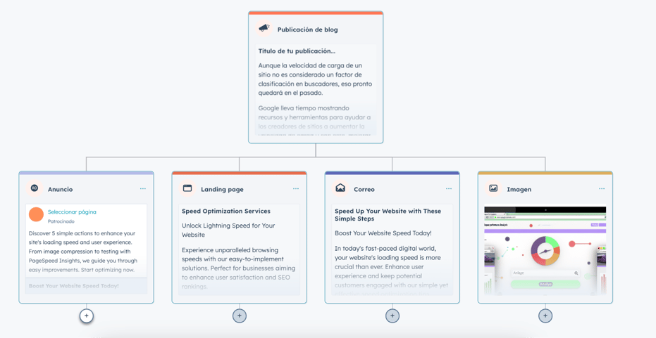 De esta manera, puedes usar una entrada de blog y luego, a través de IA, generar otros tipos de contenidos, como: imágenes, correos electrónicos, post de redes sociales, archivos de audio y más.