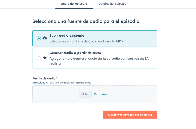 Cuando creas un podcast en HubSpot, puedes cargar tus propios archivos de audio o audio generado por IA, según decidas.