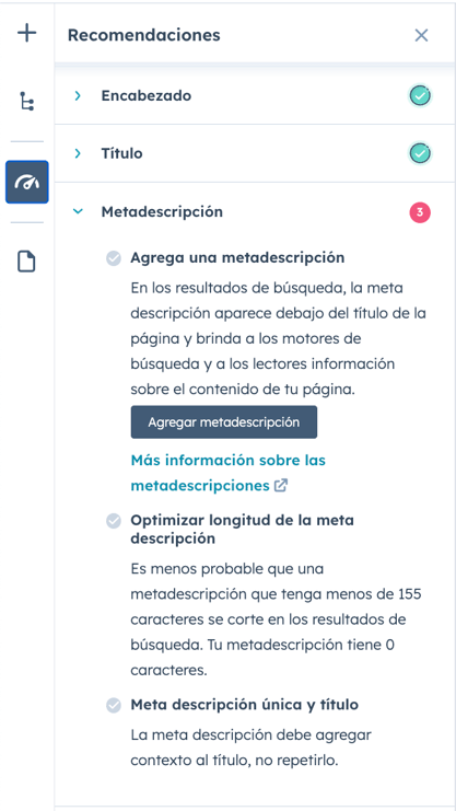 El SEO en tu sitio web está cubierto con el CMS Hub y si algo está mal, recibirás recomendaciones sobre cómo y por qué es importante realizar las optimizaciones.
